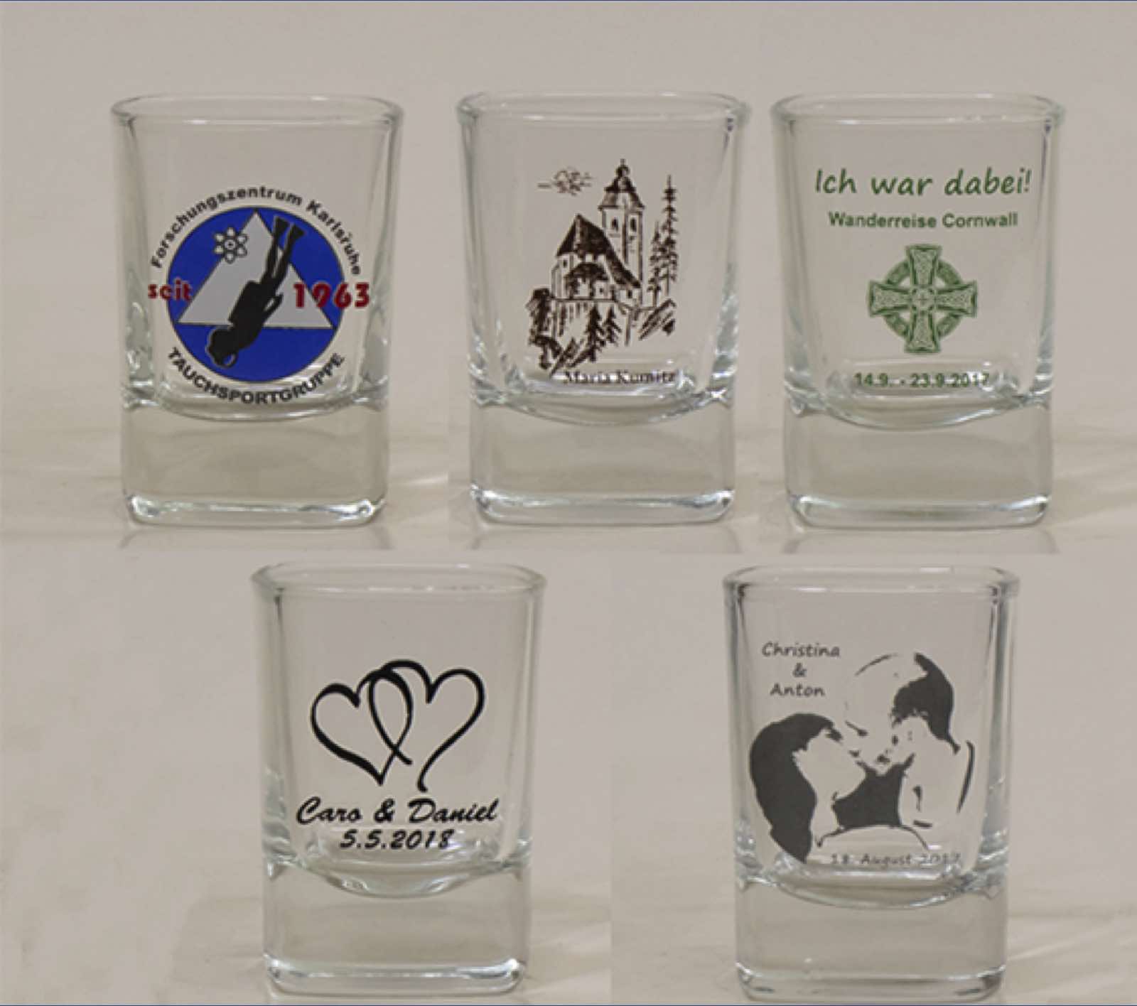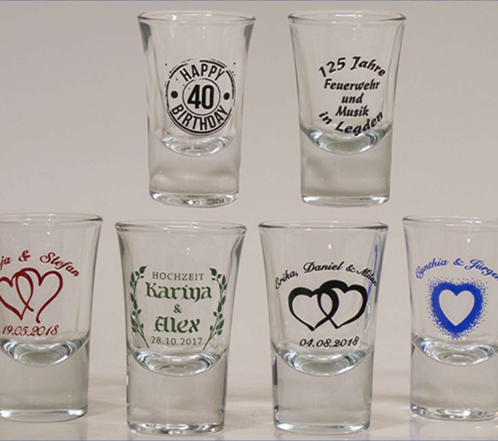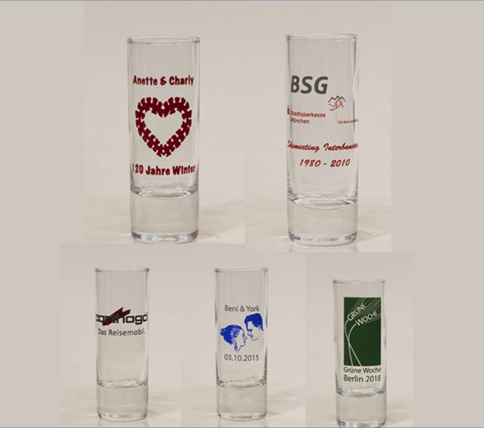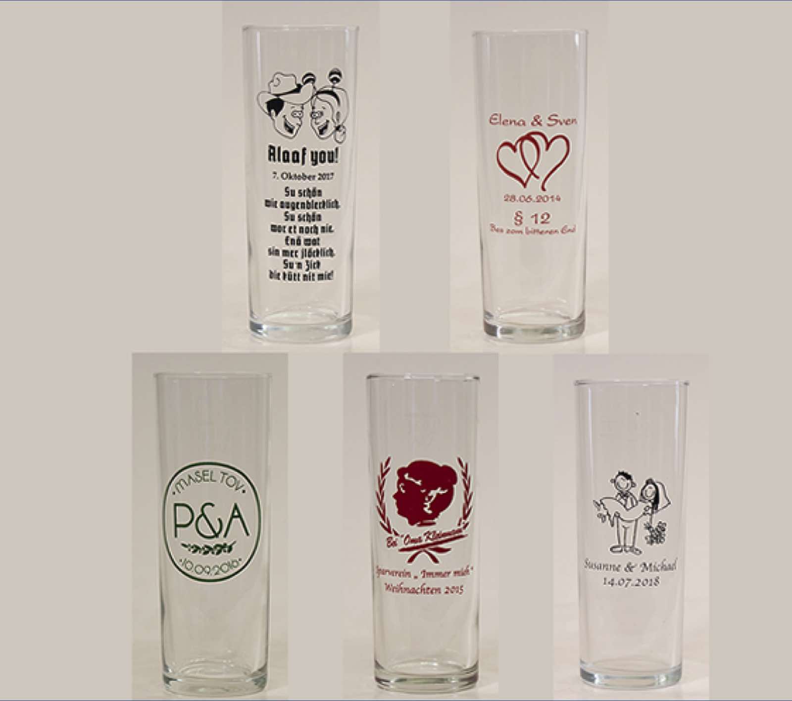 Biergläser, Schnapsgläser, Kölschgläser, Sektgläser, Weingläser, Whiskygläser, Willibecher, Maßkrüge günstig, kratzfest und spülmaschinenbeständig mit Ihrem Logo oder Motiv bedrucken lassen.